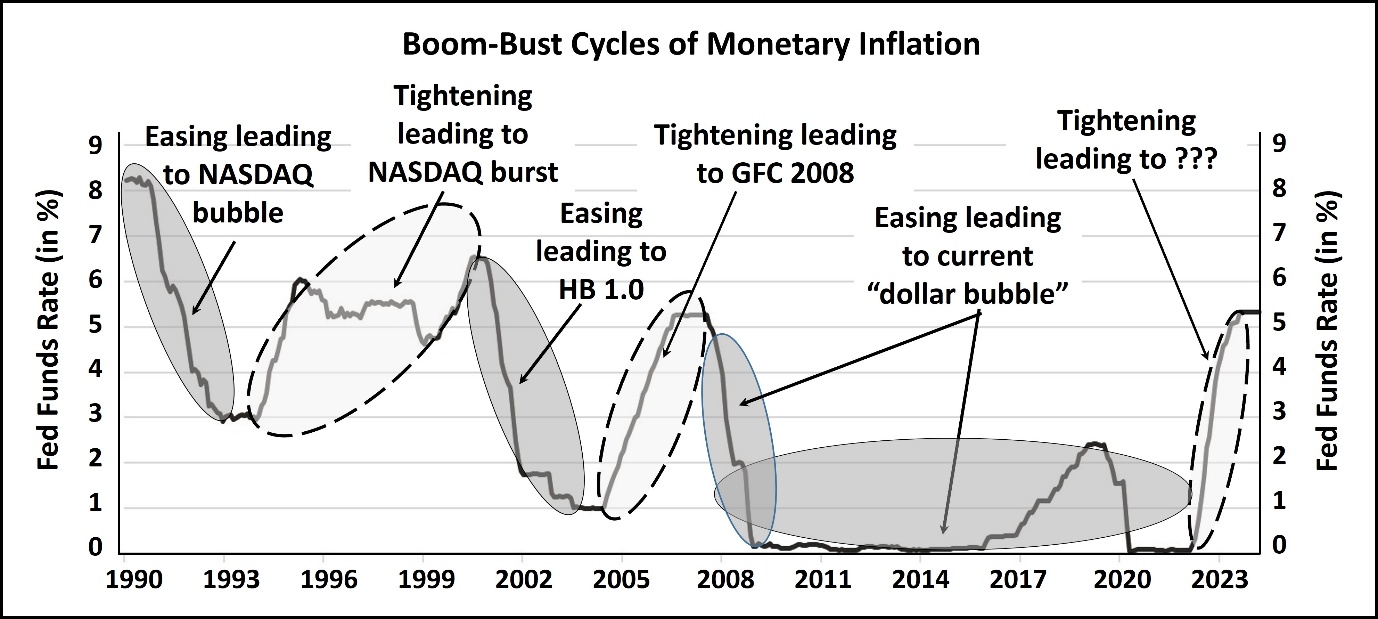 Let us start with the Federal Reserve, the engine of Monetary Inflation, a necessary condition for the formation of asset bubbles. Jim Grant popularized the arsonist-and-fireman analogy, explaining how the Fed ignites bubbles through prolonged artificially low interest rates. When the bubbles eventually meet the pin, the Fed again rushes in with easing – much like the arsonist calling the fire department. We have seen this cycle repeatedly over the last 35 years.