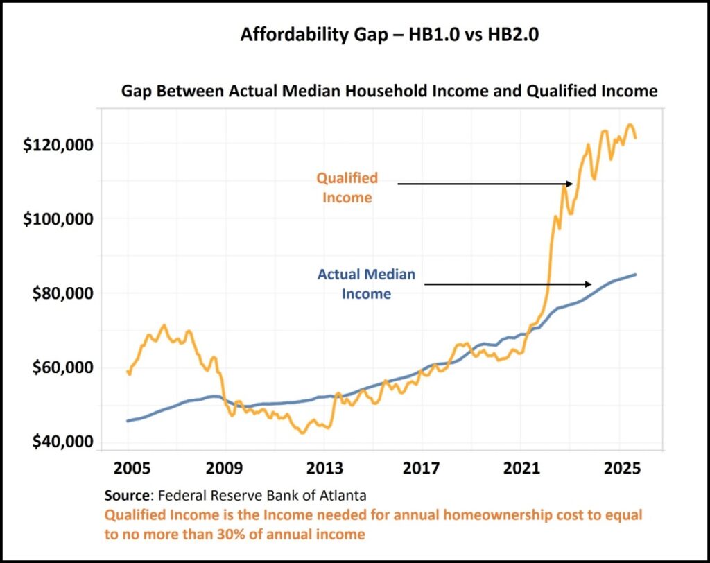 Several factors can explain why HB2.0 is much larger than HB1.0 of 2008. Some typical ones include median housing prices, inflation-adjusted housing prices, mortgage payments as a function of household income, etc. But the one Index that accounts for all factors, including home prices, household income, interest rates, taxes, and insurance, etc, is the Home Affordability Index (HAI). A modified version of the HAI is presented above to indicate that housing prices need to decline by more than 33% for affordability to return.