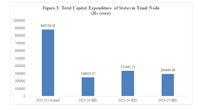 The capital outlay of Tamil Nadu has not increased substantially over the last three years. The share of capital outlay in development expenditure has declined from 19.1% in 2022-23 to 18.6% in 2024-25 (BE). Figures 2 and 3 reveal the substantially decreased overall capital expenditure over the last three years. This shows the poor attention given by the state government during the period.