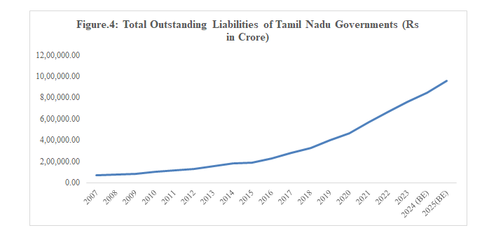 An analysis of the total outstanding liabilities of the Government of Tamil Nadu over the last two decades – nineteen years from 2007 to 2024-25 (BE), shows steady increase over the last two decades. Till 2010, the state’s total outstanding liabilities were Rs.1,01,708.7 crore only, but by the year 2021, it increased five folds to Rs.5,68,892.7 crore and further to it doubled in a span of five years to Rs.9,55,690.5 crore by the current financial year (2024-25).