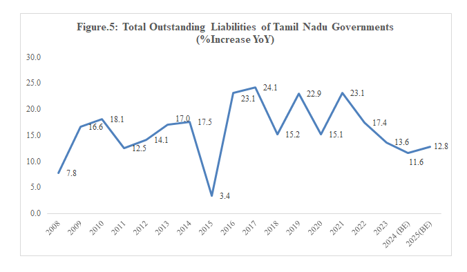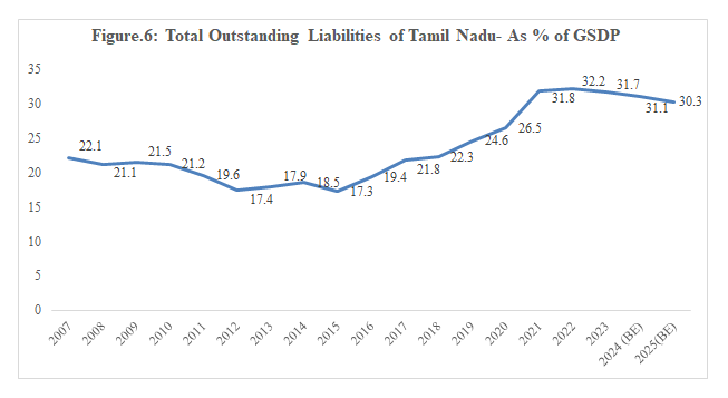 The share of total outstanding liabilities of Tamil Nadu in terms of Gross State Domestic Product (GSDP), has always been in double-digit over the last two decades and increased from 22.1% of GSDP in 2007 to 26.5% of GSDP in 2020 and further increased to 30.3% of GSDP in 2024-25 (BE).