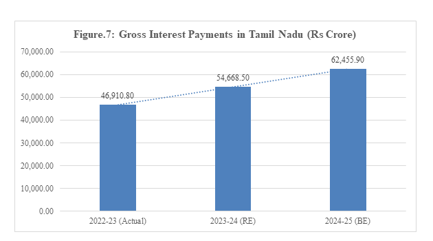 The interest payments for borrowing of the Tamil Nadu Government have steadily increased over the years. During the last three years, it has increased by 33.1% to Rs.62.455.90 crore in 2024-25 from Rs.46,910.80 crore in 2022-23.