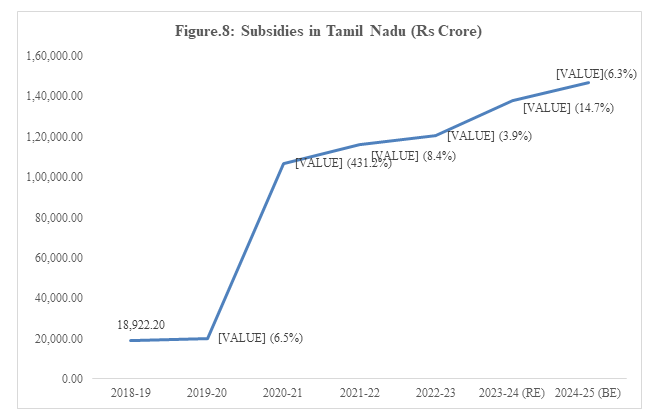 State governments across the country provide targeted subsidies to help the people uplift themselves for social and economic development. Tamil Nadu is one state that provides avoidable and unsustainable subsidies which has witnessed significant increase in the last seven years. Total subsidies provided in Tamil Nadu for food, electricity, etc. increased by 676.4% in the last seven years to Rs.1,46,908.2 crore in 2024-25 (BE) from Rs.18,922.2 crore in 2018-19.