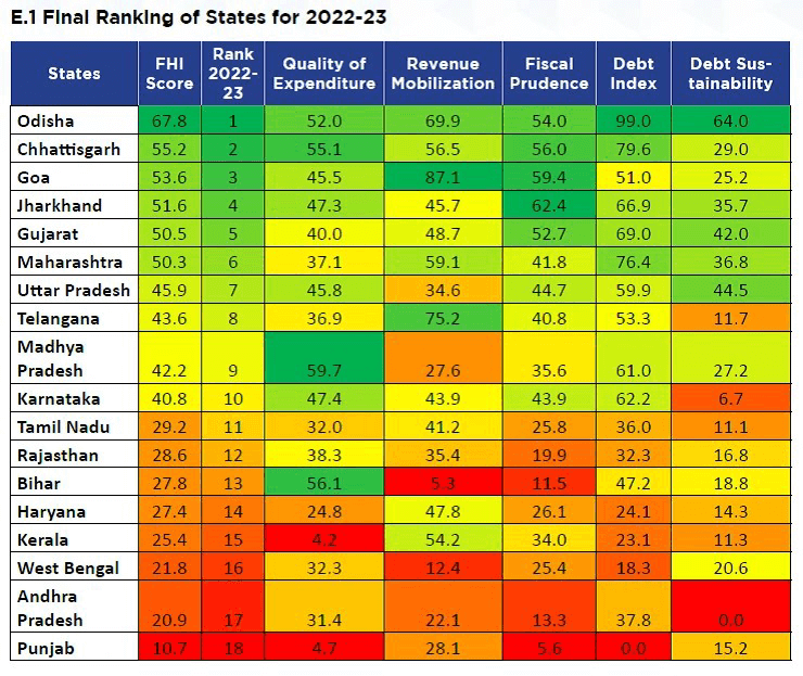Andhra Pradesh’s rank has come down from 16th position to 17th in 2022-23. It faces high fiscal deficits and lags in the quality of expenditure and revenue mobilisation. The state needs to increase its resource mobilisation and improve its quality of expenditure, while adhering to the FRBM target.