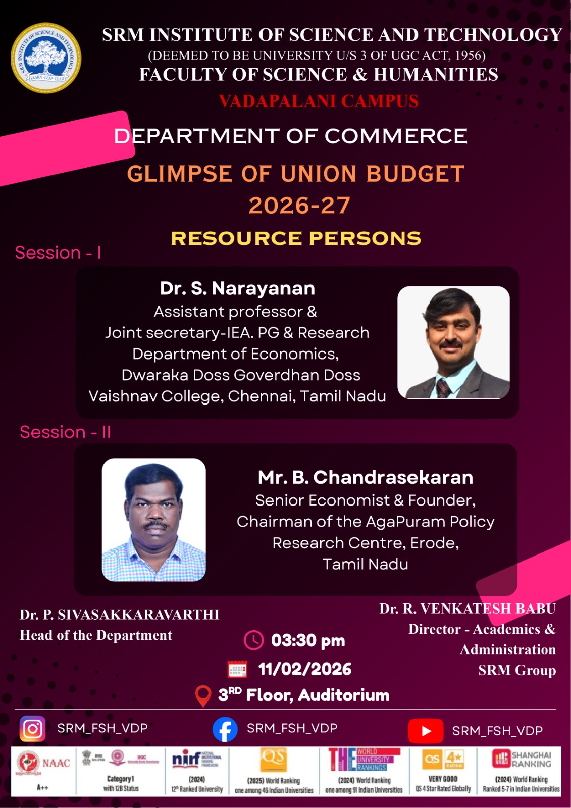 The Department of Commerce, Faculty of Science & Humanities, SRM Institute of Science and Technology, Vadapalani Campus, organized a special academic session on
