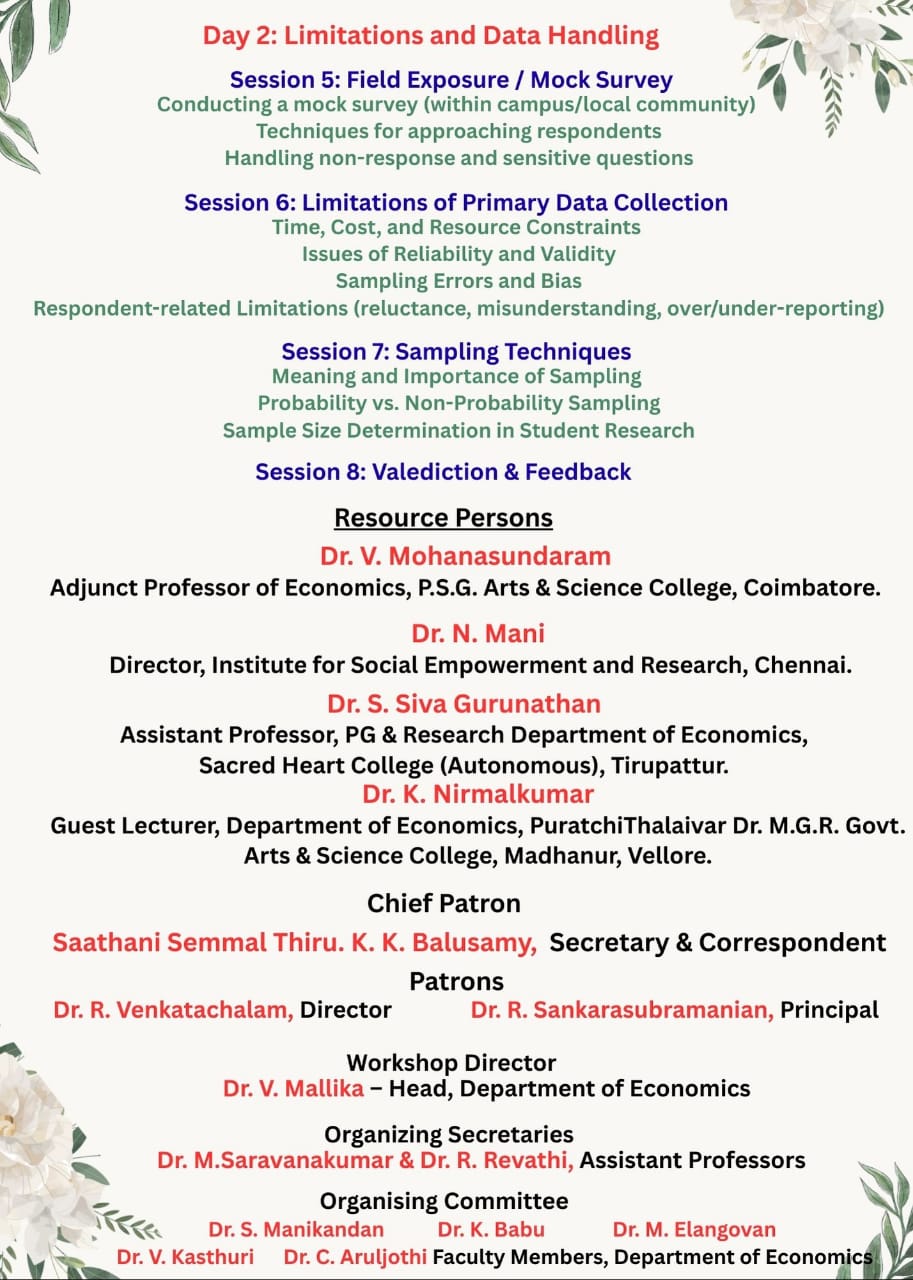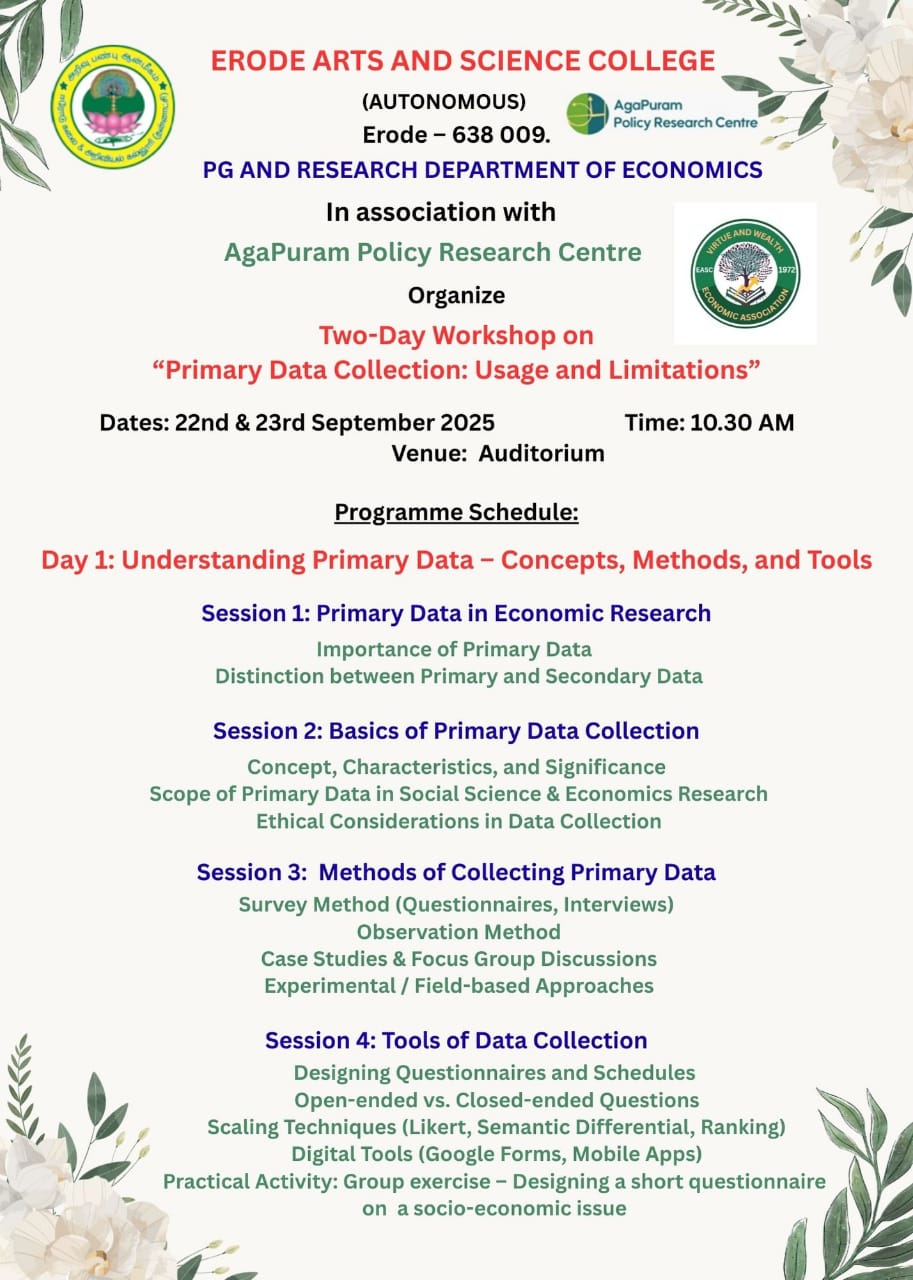 The PG and Research Department of Economics, Erode Arts and Science College, in association with AgaPuram Policy Research Centre, successfully organized a two-day national workshop on “Primary Data Collection: Usage and Limitations.”